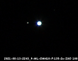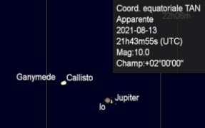 Dans le doute, j'ai changé l'objectif pour le 135/2,8. Une vérification sur Carte du Ciel m'a donné la clé de cet aspect curieux: Ganymède et Callisto avaient un rendez-vous à l'est de la planète. Pas tout à fait un Phému, mais presque. L'écart au moment de la photo au 135mm était seulement de 10,6'' d'arc.