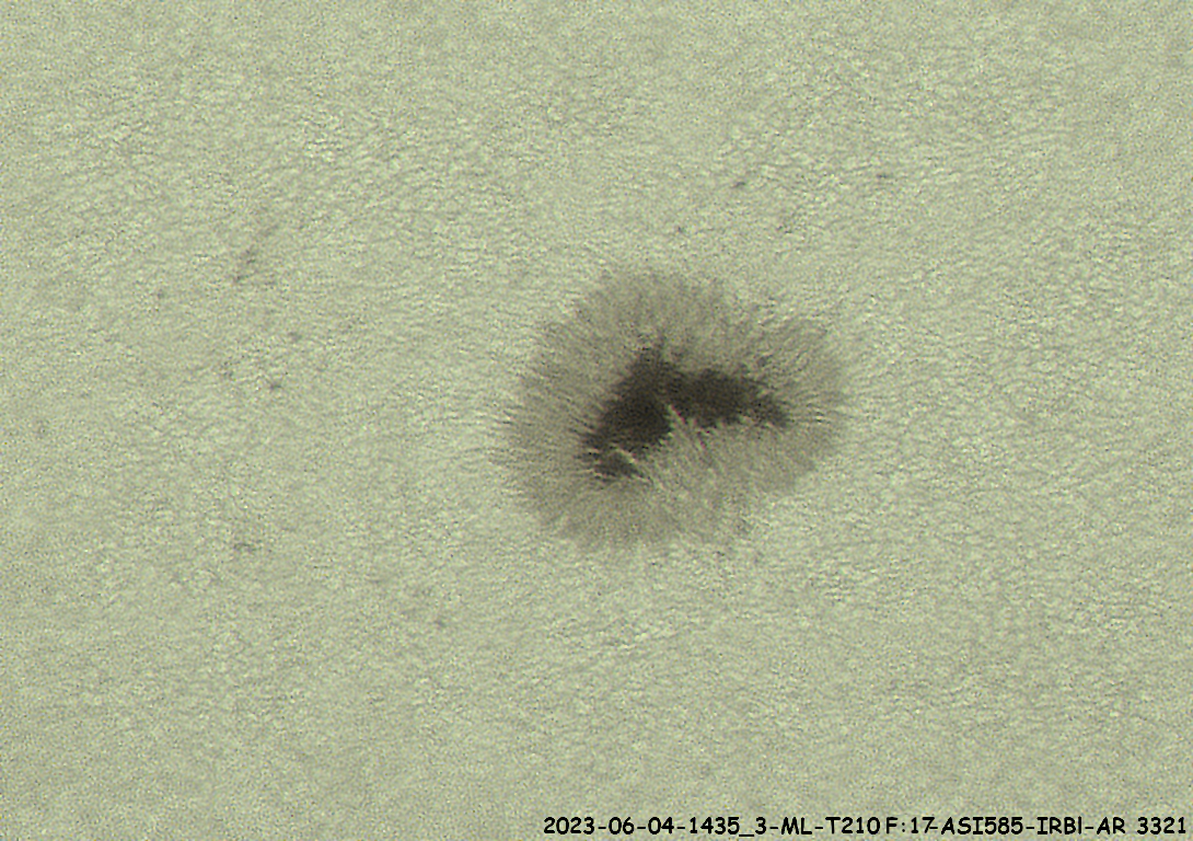 Le 4 juin dernier, j'ai bénéficié d'un ciel particulièrement calme pour imager le Soleil. Deux belles taches, de dimensions de plusieurs fois le diamètre terrestre, se partageaient l'intérêt de l'observation.